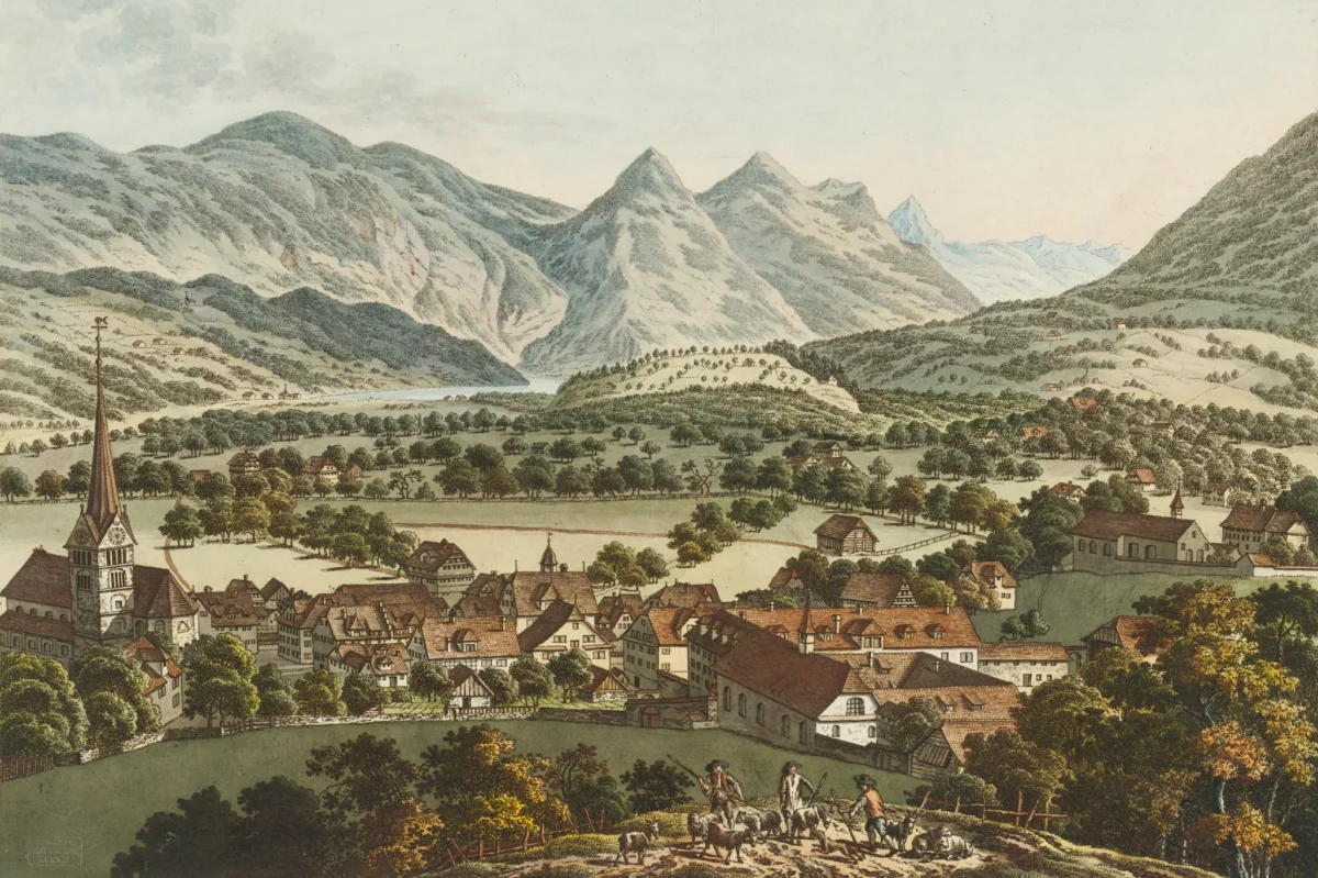 Kirchen und Klöster haben Landschaft, Raum und Gesellschaft über Jahrhunderte geprägt. Stans um 1790 mit der Pfarrkirche St. Peter (links) und dem Frauenkloster St. Klara (rechts). © Zentralbibliothek Zürich, Graphische Sammlung und Fotoarchiv (Public Domain Mark)